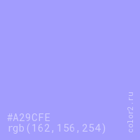 Цвет #A29CFE в цветовой модели RGB обозначается тремя октетами (162, 156, 254) в десятичном формате и #A29CFE в шестнадцатиричном (hex) формате, которые являются интенсивностью красного 162 (hex A2), интенсивность зелёного 156 (hex 9C) и интенсивность синего 254 (hex FE).