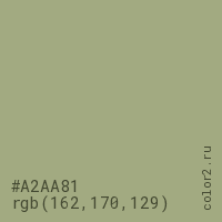 Цвет #A2AA81 в цветовой модели RGB обозначается тремя октетами (162, 170, 129) в десятичном формате и #A2AA81 в шестнадцатиричном (hex) формате, которые являются интенсивностью красного 162 (hex A2), интенсивность зелёного 170 (hex AA) и интенсивность синего 129 (hex 81).