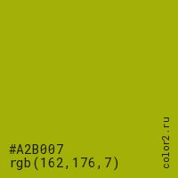 Цвет #A2B007 в цветовой модели RGB обозначается тремя октетами (162, 176, 7) в десятичном формате и #A2B007 в шестнадцатиричном (hex) формате, которые являются интенсивностью красного 162 (hex A2), интенсивность зелёного 176 (hex B0) и интенсивность синего 7 (hex 07).
