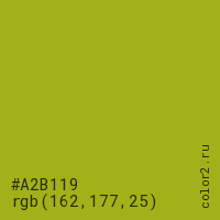 Цвет #A2B119 в цветовой модели RGB обозначается тремя октетами (162, 177, 25) в десятичном формате и #A2B119 в шестнадцатиричном (hex) формате, которые являются интенсивностью красного 162 (hex A2), интенсивность зелёного 177 (hex B1) и интенсивность синего 25 (hex 19).