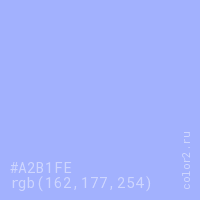 Цвет #A2B1FE в цветовой модели RGB обозначается тремя октетами (162, 177, 254) в десятичном формате и #A2B1FE в шестнадцатиричном (hex) формате, которые являются интенсивностью красного 162 (hex A2), интенсивность зелёного 177 (hex B1) и интенсивность синего 254 (hex FE).