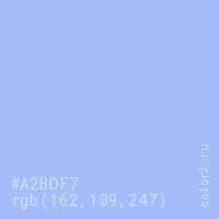 Цвет #A2BDF7 в цветовой модели RGB обозначается тремя октетами (162, 189, 247) в десятичном формате и #A2BDF7 в шестнадцатиричном (hex) формате, которые являются интенсивностью красного 162 (hex A2), интенсивность зелёного 189 (hex BD) и интенсивность синего 247 (hex F7).