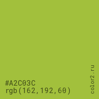 Цвет #A2C03C в цветовой модели RGB обозначается тремя октетами (162, 192, 60) в десятичном формате и #A2C03C в шестнадцатиричном (hex) формате, которые являются интенсивностью красного 162 (hex A2), интенсивность зелёного 192 (hex C0) и интенсивность синего 60 (hex 3C).
