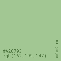 Цвет #A2C793 в цветовой модели RGB обозначается тремя октетами (162, 199, 147) в десятичном формате и #A2C793 в шестнадцатиричном (hex) формате, которые являются интенсивностью красного 162 (hex A2), интенсивность зелёного 199 (hex C7) и интенсивность синего 147 (hex 93).