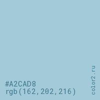 Цвет #A2CAD8 в цветовой модели RGB обозначается тремя октетами (162, 202, 216) в десятичном формате и #A2CAD8 в шестнадцатиричном (hex) формате, которые являются интенсивностью красного 162 (hex A2), интенсивность зелёного 202 (hex CA) и интенсивность синего 216 (hex D8).