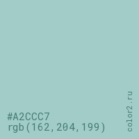 Цвет #A2CCC7 в цветовой модели RGB обозначается тремя октетами (162, 204, 199) в десятичном формате и #A2CCC7 в шестнадцатиричном (hex) формате, которые являются интенсивностью красного 162 (hex A2), интенсивность зелёного 204 (hex CC) и интенсивность синего 199 (hex C7).