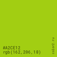 Цвет #A2CE12 в цветовой модели RGB обозначается тремя октетами (162, 206, 18) в десятичном формате и #A2CE12 в шестнадцатиричном (hex) формате, которые являются интенсивностью красного 162 (hex A2), интенсивность зелёного 206 (hex CE) и интенсивность синего 18 (hex 12).