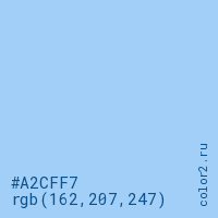 Цвет #A2CFF7 в цветовой модели RGB обозначается тремя октетами (162, 207, 247) в десятичном формате и #A2CFF7 в шестнадцатиричном (hex) формате, которые являются интенсивностью красного 162 (hex A2), интенсивность зелёного 207 (hex CF) и интенсивность синего 247 (hex F7).