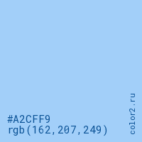 Цвет #A2CFF9 в цветовой модели RGB обозначается тремя октетами (162, 207, 249) в десятичном формате и #A2CFF9 в шестнадцатиричном (hex) формате, которые являются интенсивностью красного 162 (hex A2), интенсивность зелёного 207 (hex CF) и интенсивность синего 249 (hex F9).