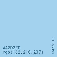 Цвет #A2D2ED в цветовой модели RGB обозначается тремя октетами (162, 210, 237) в десятичном формате и #A2D2ED в шестнадцатиричном (hex) формате, которые являются интенсивностью красного 162 (hex A2), интенсивность зелёного 210 (hex D2) и интенсивность синего 237 (hex ED).