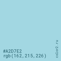 Цвет #A2D7E2 в цветовой модели RGB обозначается тремя октетами (162, 215, 226) в десятичном формате и #A2D7E2 в шестнадцатиричном (hex) формате, которые являются интенсивностью красного 162 (hex A2), интенсивность зелёного 215 (hex D7) и интенсивность синего 226 (hex E2).