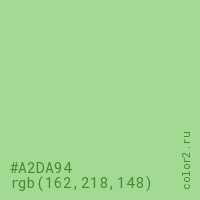 Цвет #A2DA94 в цветовой модели RGB обозначается тремя октетами (162, 218, 148) в десятичном формате и #A2DA94 в шестнадцатиричном (hex) формате, которые являются интенсивностью красного 162 (hex A2), интенсивность зелёного 218 (hex DA) и интенсивность синего 148 (hex 94).