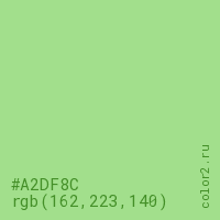 Цвет #A2DF8C в цветовой модели RGB обозначается тремя октетами (162, 223, 140) в десятичном формате и #A2DF8C в шестнадцатиричном (hex) формате, которые являются интенсивностью красного 162 (hex A2), интенсивность зелёного 223 (hex DF) и интенсивность синего 140 (hex 8C).