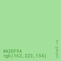 Цвет #A2DF9A в цветовой модели RGB обозначается тремя октетами (162, 223, 154) в десятичном формате и #A2DF9A в шестнадцатиричном (hex) формате, которые являются интенсивностью красного 162 (hex A2), интенсивность зелёного 223 (hex DF) и интенсивность синего 154 (hex 9A).