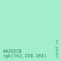 Цвет #A2EECB в цветовой модели RGB обозначается тремя октетами (162, 238, 203) в десятичном формате и #A2EECB в шестнадцатиричном (hex) формате, которые являются интенсивностью красного 162 (hex A2), интенсивность зелёного 238 (hex EE) и интенсивность синего 203 (hex CB).