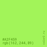Цвет #A2F459 в цветовой модели RGB обозначается тремя октетами (162, 244, 89) в десятичном формате и #A2F459 в шестнадцатиричном (hex) формате, которые являются интенсивностью красного 162 (hex A2), интенсивность зелёного 244 (hex F4) и интенсивность синего 89 (hex 59).