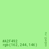 Цвет #A2F492 в цветовой модели RGB обозначается тремя октетами (162, 244, 146) в десятичном формате и #A2F492 в шестнадцатиричном (hex) формате, которые являются интенсивностью красного 162 (hex A2), интенсивность зелёного 244 (hex F4) и интенсивность синего 146 (hex 92).