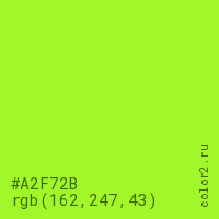 Цвет #A2F72B в цветовой модели RGB обозначается тремя октетами (162, 247, 43) в десятичном формате и #A2F72B в шестнадцатиричном (hex) формате, которые являются интенсивностью красного 162 (hex A2), интенсивность зелёного 247 (hex F7) и интенсивность синего 43 (hex 2B).