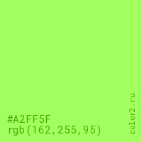 Цвет #A2FF5F в цветовой модели RGB обозначается тремя октетами (162, 255, 95) в десятичном формате и #A2FF5F в шестнадцатиричном (hex) формате, которые являются интенсивностью красного 162 (hex A2), интенсивность зелёного 255 (hex FF) и интенсивность синего 95 (hex 5F).