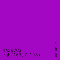 Цвет #A307C3 в цветовой модели RGB обозначается тремя октетами (163, 7, 195) в десятичном формате и #A307C3 в шестнадцатиричном (hex) формате, которые являются интенсивностью красного 163 (hex A3), интенсивность зелёного 7 (hex 07) и интенсивность синего 195 (hex C3).