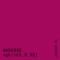 Цвет #A3085D в цветовой модели RGB обозначается тремя октетами (163, 8, 93) в десятичном формате и #A3085D в шестнадцатиричном (hex) формате, которые являются интенсивностью красного 163 (hex A3), интенсивность зелёного 8 (hex 08) и интенсивность синего 93 (hex 5D).