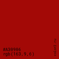 Цвет #A30906 в цветовой модели RGB обозначается тремя октетами (163, 9, 6) в десятичном формате и #A30906 в шестнадцатиричном (hex) формате, которые являются интенсивностью красного 163 (hex A3), интенсивность зелёного 9 (hex 09) и интенсивность синего 6 (hex 06).