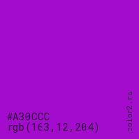 Цвет #A30CCC в цветовой модели RGB обозначается тремя октетами (163, 12, 204) в десятичном формате и #A30CCC в шестнадцатиричном (hex) формате, которые являются интенсивностью красного 163 (hex A3), интенсивность зелёного 12 (hex 0C) и интенсивность синего 204 (hex CC).