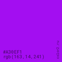 Цвет #A30EF1 в цветовой модели RGB обозначается тремя октетами (163, 14, 241) в десятичном формате и #A30EF1 в шестнадцатиричном (hex) формате, которые являются интенсивностью красного 163 (hex A3), интенсивность зелёного 14 (hex 0E) и интенсивность синего 241 (hex F1).