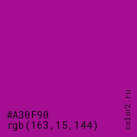 Цвет #A30F90 в цветовой модели RGB обозначается тремя октетами (163, 15, 144) в десятичном формате и #A30F90 в шестнадцатиричном (hex) формате, которые являются интенсивностью красного 163 (hex A3), интенсивность зелёного 15 (hex 0F) и интенсивность синего 144 (hex 90).
