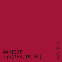 Цвет #A31335 в цветовой модели RGB обозначается тремя октетами (163, 19, 53) в десятичном формате и #A31335 в шестнадцатиричном (hex) формате, которые являются интенсивностью красного 163 (hex A3), интенсивность зелёного 19 (hex 13) и интенсивность синего 53 (hex 35).