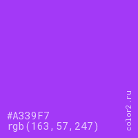 Цвет #A339F7 в цветовой модели RGB обозначается тремя октетами (163, 57, 247) в десятичном формате и #A339F7 в шестнадцатиричном (hex) формате, которые являются интенсивностью красного 163 (hex A3), интенсивность зелёного 57 (hex 39) и интенсивность синего 247 (hex F7).