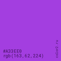 Цвет #A33EE0 в цветовой модели RGB обозначается тремя октетами (163, 62, 224) в десятичном формате и #A33EE0 в шестнадцатиричном (hex) формате, которые являются интенсивностью красного 163 (hex A3), интенсивность зелёного 62 (hex 3E) и интенсивность синего 224 (hex E0).