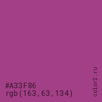 Цвет #A33F86 в цветовой модели RGB обозначается тремя октетами (163, 63, 134) в десятичном формате и #A33F86 в шестнадцатиричном (hex) формате, которые являются интенсивностью красного 163 (hex A3), интенсивность зелёного 63 (hex 3F) и интенсивность синего 134 (hex 86).