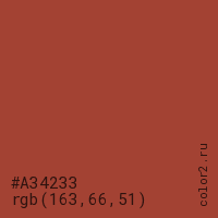 Цвет #A34233 в цветовой модели RGB обозначается тремя октетами (163, 66, 51) в десятичном формате и #A34233 в шестнадцатиричном (hex) формате, которые являются интенсивностью красного 163 (hex A3), интенсивность зелёного 66 (hex 42) и интенсивность синего 51 (hex 33).