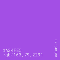 Цвет #A34FE5 в цветовой модели RGB обозначается тремя октетами (163, 79, 229) в десятичном формате и #A34FE5 в шестнадцатиричном (hex) формате, которые являются интенсивностью красного 163 (hex A3), интенсивность зелёного 79 (hex 4F) и интенсивность синего 229 (hex E5).