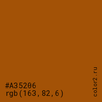Цвет #A35206 в цветовой модели RGB обозначается тремя октетами (163, 82, 6) в десятичном формате и #A35206 в шестнадцатиричном (hex) формате, которые являются интенсивностью красного 163 (hex A3), интенсивность зелёного 82 (hex 52) и интенсивность синего 6 (hex 06).