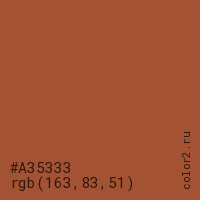 Цвет #A35333 в цветовой модели RGB обозначается тремя октетами (163, 83, 51) в десятичном формате и #A35333 в шестнадцатиричном (hex) формате, которые являются интенсивностью красного 163 (hex A3), интенсивность зелёного 83 (hex 53) и интенсивность синего 51 (hex 33).