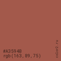 Цвет #A3594B в цветовой модели RGB обозначается тремя октетами (163, 89, 75) в десятичном формате и #A3594B в шестнадцатиричном (hex) формате, которые являются интенсивностью красного 163 (hex A3), интенсивность зелёного 89 (hex 59) и интенсивность синего 75 (hex 4B).