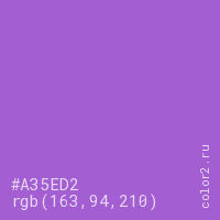 Цвет #A35ED2 в цветовой модели RGB обозначается тремя октетами (163, 94, 210) в десятичном формате и #A35ED2 в шестнадцатиричном (hex) формате, которые являются интенсивностью красного 163 (hex A3), интенсивность зелёного 94 (hex 5E) и интенсивность синего 210 (hex D2).