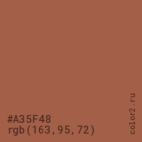 Цвет #A35F48 в цветовой модели RGB обозначается тремя октетами (163, 95, 72) в десятичном формате и #A35F48 в шестнадцатиричном (hex) формате, которые являются интенсивностью красного 163 (hex A3), интенсивность зелёного 95 (hex 5F) и интенсивность синего 72 (hex 48).