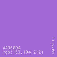 Цвет #A368D4 в цветовой модели RGB обозначается тремя октетами (163, 104, 212) в десятичном формате и #A368D4 в шестнадцатиричном (hex) формате, которые являются интенсивностью красного 163 (hex A3), интенсивность зелёного 104 (hex 68) и интенсивность синего 212 (hex D4).
