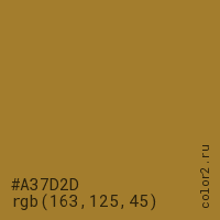 Цвет #A37D2D в цветовой модели RGB обозначается тремя октетами (163, 125, 45) в десятичном формате и #A37D2D в шестнадцатиричном (hex) формате, которые являются интенсивностью красного 163 (hex A3), интенсивность зелёного 125 (hex 7D) и интенсивность синего 45 (hex 2D).