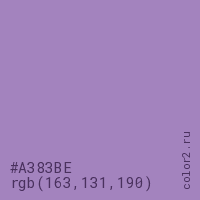 Цвет #A383BE в цветовой модели RGB обозначается тремя октетами (163, 131, 190) в десятичном формате и #A383BE в шестнадцатиричном (hex) формате, которые являются интенсивностью красного 163 (hex A3), интенсивность зелёного 131 (hex 83) и интенсивность синего 190 (hex BE).