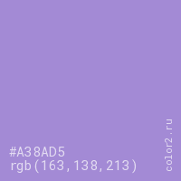 Цвет #A38AD5 в цветовой модели RGB обозначается тремя октетами (163, 138, 213) в десятичном формате и #A38AD5 в шестнадцатиричном (hex) формате, которые являются интенсивностью красного 163 (hex A3), интенсивность зелёного 138 (hex 8A) и интенсивность синего 213 (hex D5).