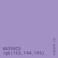 Цвет #A390C3 в цветовой модели RGB обозначается тремя октетами (163, 144, 195) в десятичном формате и #A390C3 в шестнадцатиричном (hex) формате, которые являются интенсивностью красного 163 (hex A3), интенсивность зелёного 144 (hex 90) и интенсивность синего 195 (hex C3).