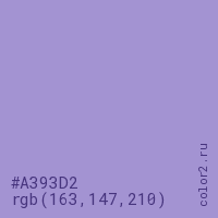Цвет #A393D2 в цветовой модели RGB обозначается тремя октетами (163, 147, 210) в десятичном формате и #A393D2 в шестнадцатиричном (hex) формате, которые являются интенсивностью красного 163 (hex A3), интенсивность зелёного 147 (hex 93) и интенсивность синего 210 (hex D2).