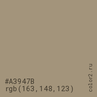 Цвет #A3947B в цветовой модели RGB обозначается тремя октетами (163, 148, 123) в десятичном формате и #A3947B в шестнадцатиричном (hex) формате, которые являются интенсивностью красного 163 (hex A3), интенсивность зелёного 148 (hex 94) и интенсивность синего 123 (hex 7B).