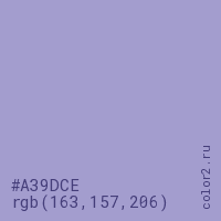 Цвет #A39DCE в цветовой модели RGB обозначается тремя октетами (163, 157, 206) в десятичном формате и #A39DCE в шестнадцатиричном (hex) формате, которые являются интенсивностью красного 163 (hex A3), интенсивность зелёного 157 (hex 9D) и интенсивность синего 206 (hex CE).