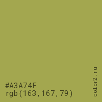 Цвет #A3A74F в цветовой модели RGB обозначается тремя октетами (163, 167, 79) в десятичном формате и #A3A74F в шестнадцатиричном (hex) формате, которые являются интенсивностью красного 163 (hex A3), интенсивность зелёного 167 (hex A7) и интенсивность синего 79 (hex 4F).