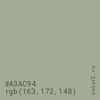 Цвет #A3AC94 в цветовой модели RGB обозначается тремя октетами (163, 172, 148) в десятичном формате и #A3AC94 в шестнадцатиричном (hex) формате, которые являются интенсивностью красного 163 (hex A3), интенсивность зелёного 172 (hex AC) и интенсивность синего 148 (hex 94).